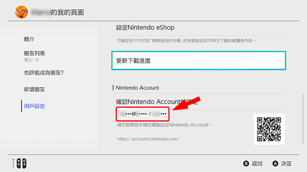 ※如下所示,會顯示連動的Nintendo Account(因隱私保護,部分內容隱藏)。當不顯示電郵地址(@)時,兒童帳號已連動