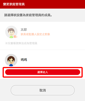 成為了家庭「管理者」的Nintendo Account可將同一家庭的成員(18歲或以上的帳號)變更成管理者。詳細步驟請參閱以下內容。
