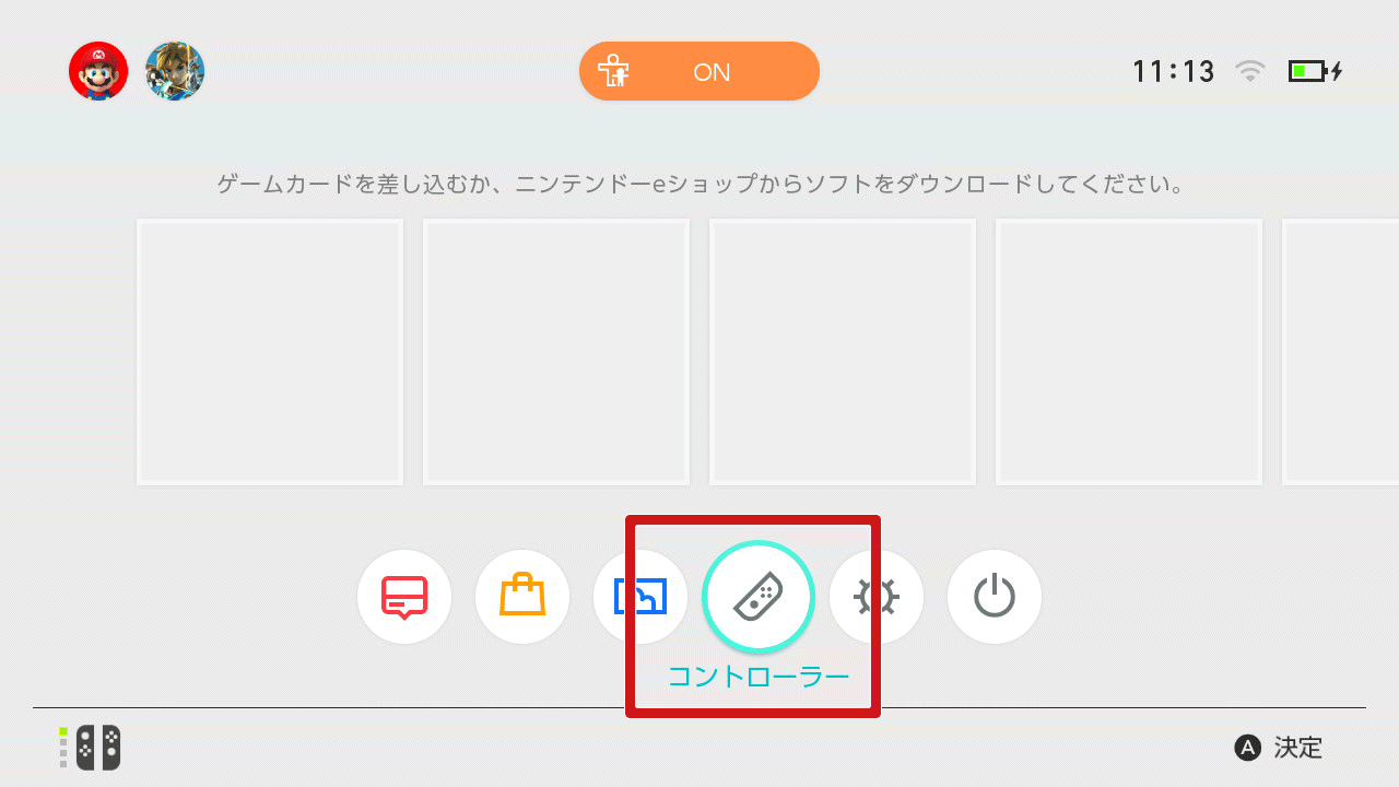 可在HOME選單的「コントローラー(控制器)」確認已連接的控制器。無法辨識時,請從「持ちかた/順番を変える(變更握法/順序)」重新連接。